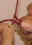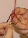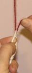 1. Hold the white loop, pass the end of the thread behind the taut thread forming a red loop (G).